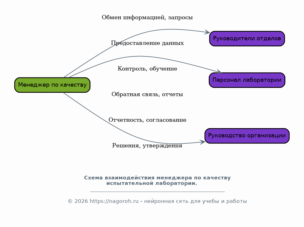 Руководитель лаборатории обеспечивает необходимые ресурсы для выполнения менеджером по качеству его обязанностей и утверждает документацию по качеству, разработанную им. Взаимодействие осуществляется посредством совещаний и предоставления отчетов.