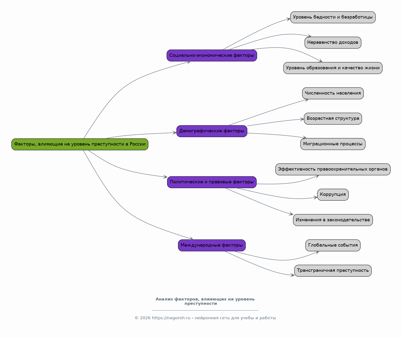 В данном разделе будет проведен анализ различных факторов, оказывающих влияние на уровень и структуру преступности в России. Рассматриваются социально-экономические факторы: уровень бедности и безработицы, неравенство доходов, уровень образования и качество жизни населения. Анализируются демографические факторы: численность населения, возрастная структура, миграционные процессы. Также рассматриваются политические и правовые факторы: эффективность правоохранительных органов, коррупция, изменения в законодательстве, а также международные факторы и их влияние.