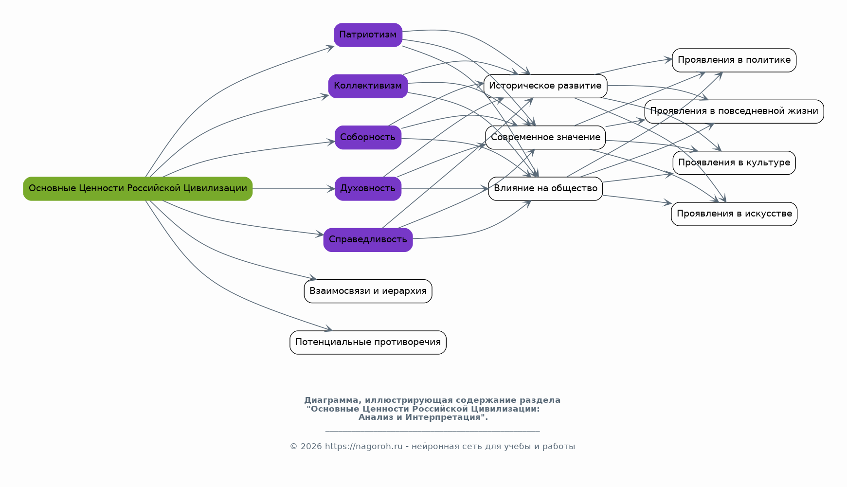 Этот раздел посвящен детальному анализу ключевых ценностей, определяющих специфику российской цивилизации. Будут рассмотрены такие понятия, как соборность, духовность, справедливость, патриотизм, коллективизм и другие. Каждый из этих аспектов будет проанализирован с точки зрения его исторического развития, современного значения и влияния на различные сферы жизни общества. Проанализируем, как эти ценности проявляются в культуре, искусстве, политике и повседневной жизни. Ставится задача показать взаимосвязь между ними, их иерархию и потенциальные противоречия.