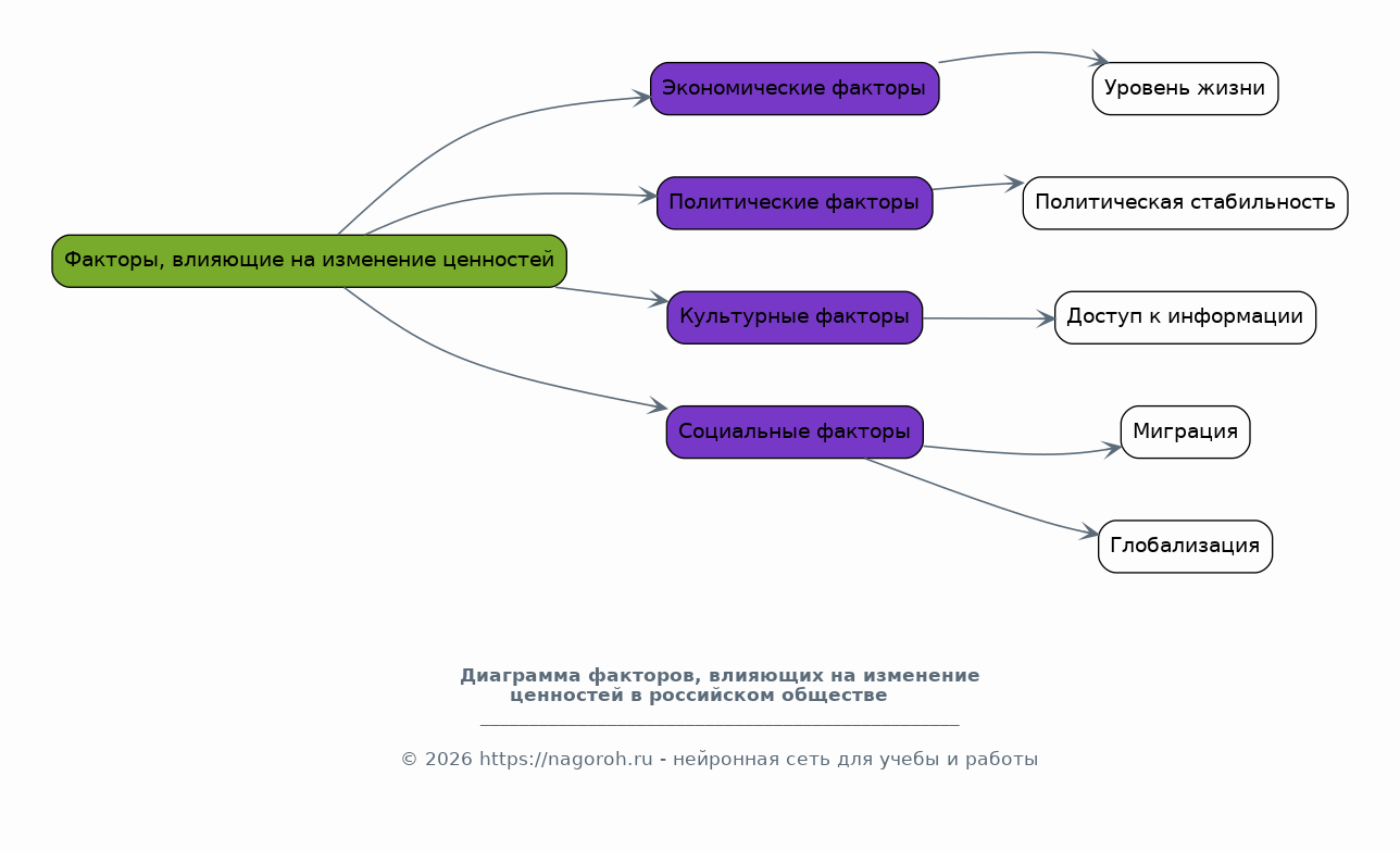 В данном разделе будет проведен анализ основных факторов, влияющих на изменение ценностных ориентаций в российском обществе. Будут рассмотрены экономические, политические, культурные и социальные факторы, такие как уровень жизни, политическая стабильность, доступ к информации, миграция и глобализация. Анализ включает рассмотрение влияния СМИ, интернета и других каналов коммуникации на формирование ценностей. Этот раздел будет раскрывать механизмы, посредством которых различные факторы оказывают влияние на изменение ценностей в современном российском обществе.