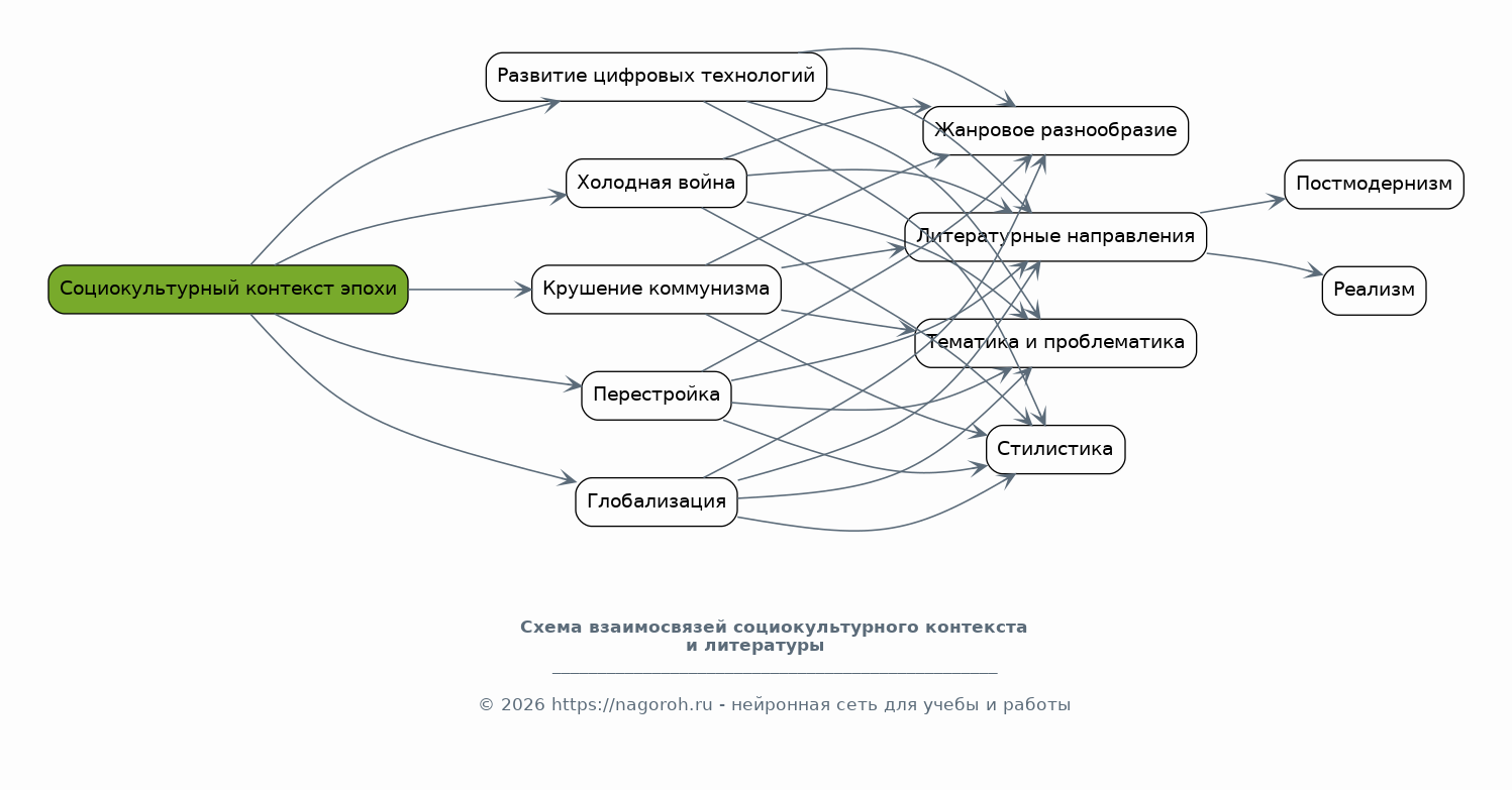 Данный раздел посвящен анализу социокультурного контекста, сформировавшего литературную среду второй половины XX – начала XXI века. Будут рассмотрены такие факторы, как холодная война, крушение коммунизма, перестройка, глобализация и развитие цифровых технологий. Анализируется влияние этих факторов на тематику, проблематику, стилистику и жанровое разнообразие литературных произведений. Также будет рассмотрено влияние данных процессов на формирование литературных направлений, таких как постмодернизм, реализм и другие. Особое внимание уделено роли литературы в отражении и осмыслении общественных изменений.