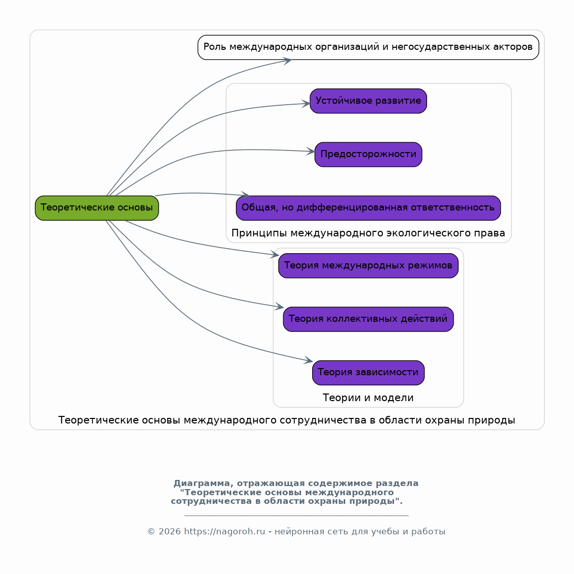 Этот раздел посвящен анализу теоретических подходов и концепций, лежащих в основе международного сотрудничества в области охраны природы. Рассматриваются различные теории и модели, объясняющие мотивацию стран к сотрудничеству, такие как теория международных режимов, теория коллективных действий и теория зависимости. Анализируются основные принципы международного экологического права, включая принципы устойчивого развития, предосторожности и общей, но дифференцированной ответственности. Обсуждаются роль международных организаций и негосударственных акторов в продвижении сотрудничества.