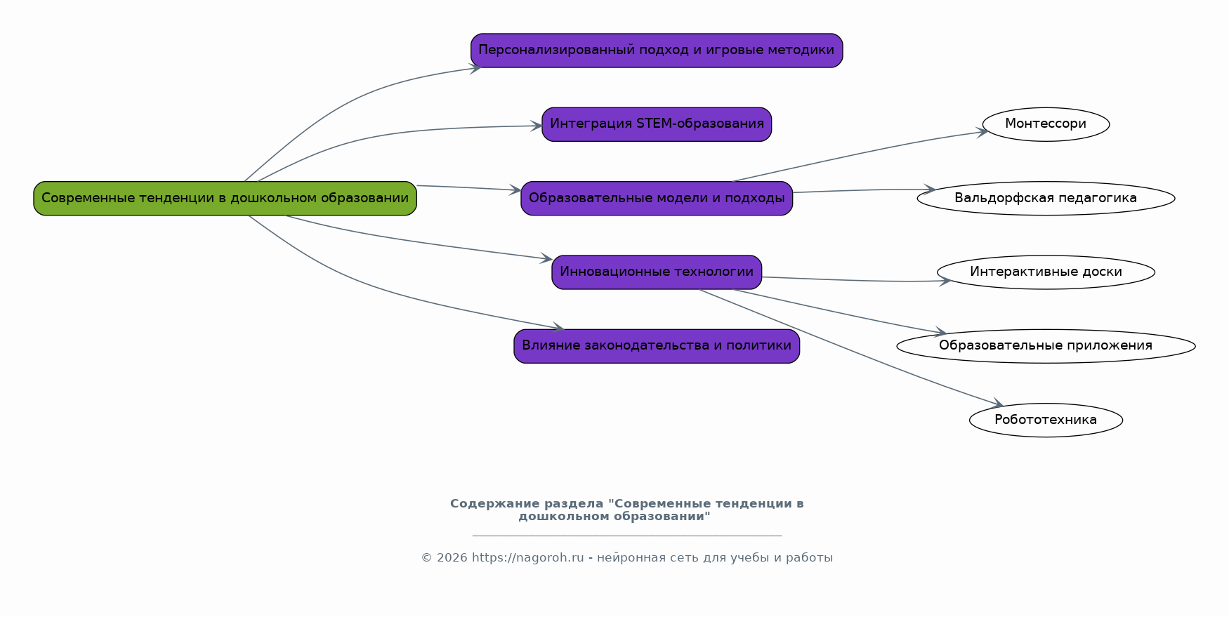 Данный раздел посвящен анализу текущих трендов в дошкольном образовании, включая персонализированный подход к обучению, игровые методики и интеграцию STEM-образования. Рассматриваются различные образовательные модели и подходы, такие как Монтессори, Вальдорфская педагогика и другие, с акцентом на их сильные и слабые стороны. Анализируется опыт внедрения инновационных технологий, таких как интерактивные доски, образовательные приложения и робототехника, в дошкольных учреждениях. Изучается влияние изменений в законодательстве и политике на развитие дошкольного образования.
