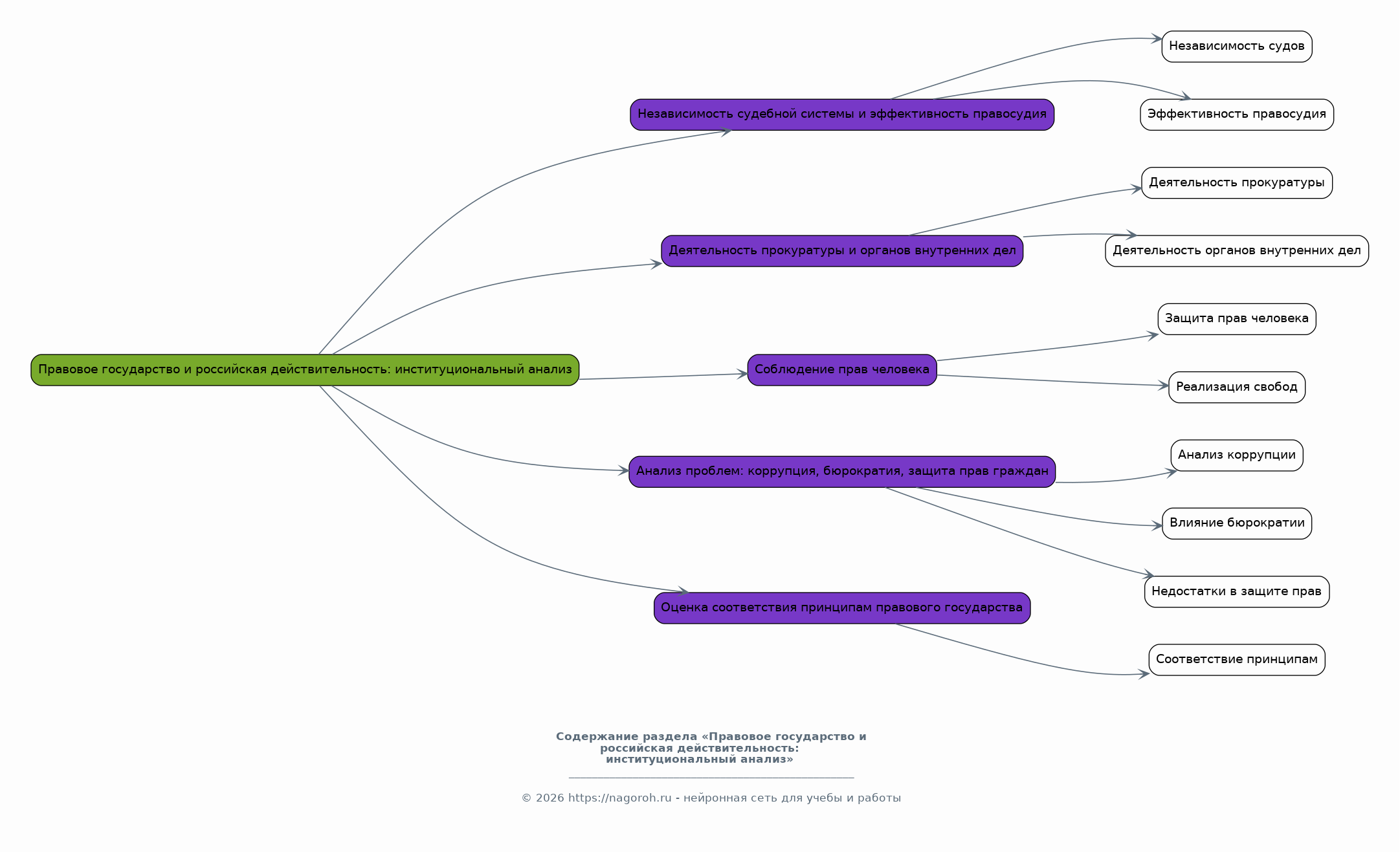 Данный раздел посвящен анализу состояния институтов правового государства в современной России. Будут рассмотрены такие аспекты, как независимость судебной системы и эффективность правосудия, деятельность прокуратуры и органов внутренних дел, а также соблюдение прав человека. Особое внимание будет уделено анализу проблем, связанных с коррупцией, бюрократией и недостаточной защитой прав граждан. Будет проведена оценка соответствия российской правовой системы принципам правового государства. Будут изучены основные проблемы, оказывающие негативное влияние.