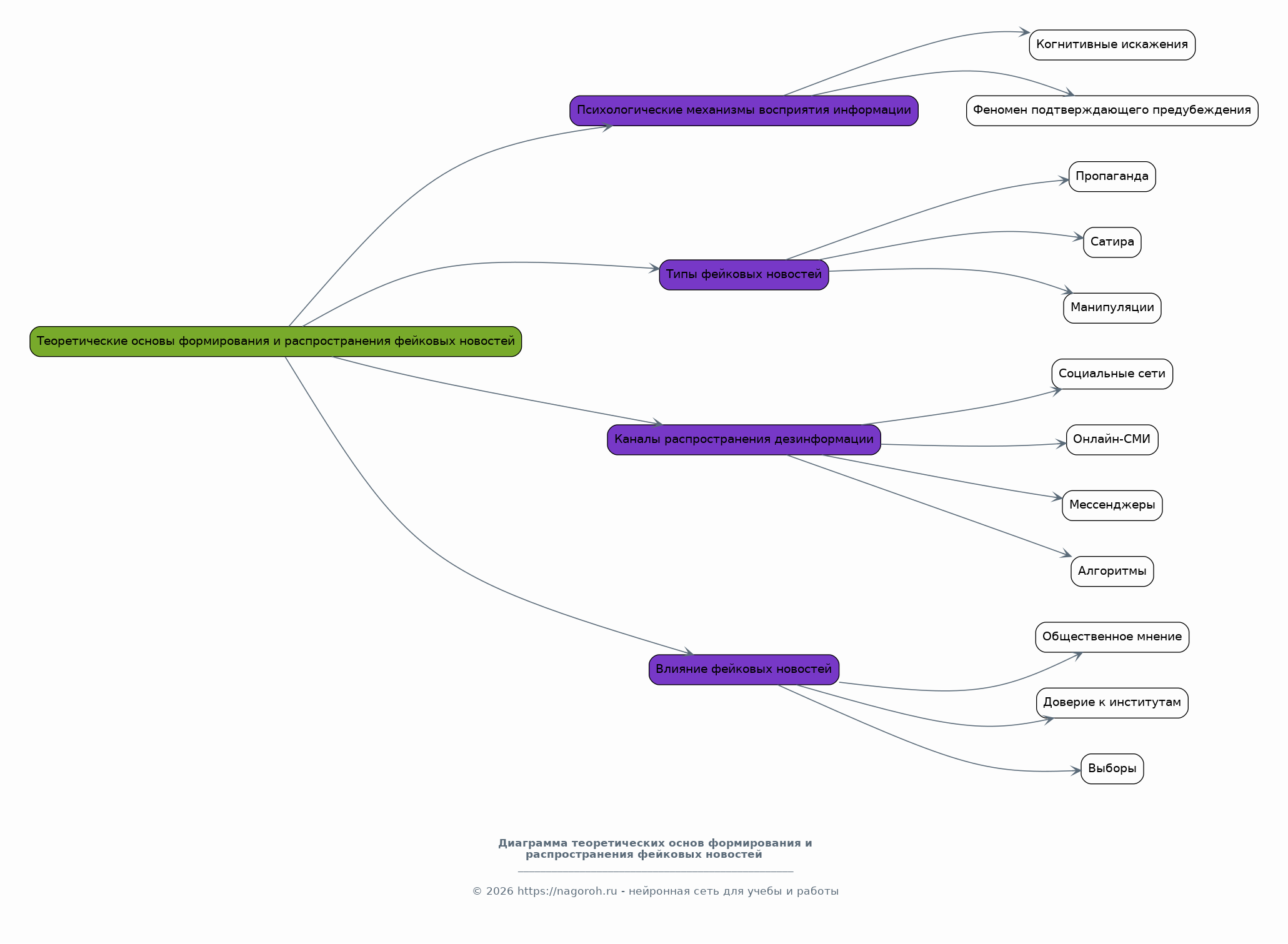 В данном разделе рассматриваются теоретические аспекты возникновения и распространения фейковых новостей. Анализируются психологические механизмы восприятия информации, когнитивные искажения и феномен подтверждающего предубеждения. Изучаются различные типы фейковых новостей, включая пропаганду, сатиру и манипуляции. Рассматриваются каналы распространения дезинформации, такие как социальные сети, онлайн-СМИ и мессенджеры, а также роль алгоритмов в усилении этого процесса. Обсуждается влияние фейковых новостей на различные аспекты: общественное мнение, доверие к институтам и выборы.