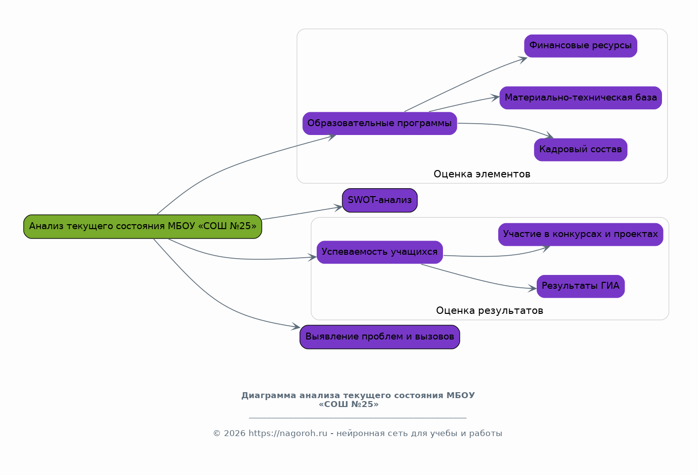 Данный раздел посвящен всестороннему анализу текущего состояния школы, включая оценку образовательных программ, кадрового состава, материально-технической базы и финансовых ресурсов. Будет проведен SWOT-анализ, позволяющий выявить сильные и слабые стороны, возможности и угрозы, влияющие на развитие школы. Также будет проанализирована текущая успеваемость учащихся, результаты государственной итоговой аттестации, а также участие школы в различных конкурсах и проектах. Особое внимание будет уделено выявлению текущих проблем и вызовов, с которыми сталкивается школа, для последующей разработки эффективных решений.