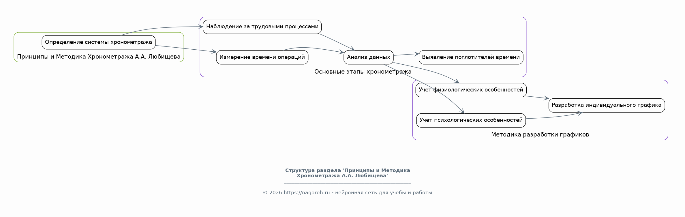 В данном докладе рассматривается система хронометража, разработанная А.А. Любищевым, и ее вклад в оптимизацию трудовых процессов и повышение личной эффективности. Анализируются ключевые принципы методики, включая детальный учет времени, выявление «поглотителей времени» и разработку индивидуальных графиков работы. Особое внимание уделяется практическим аспектам применения системы в различных сферах деятельности, от промышленного производства до повседневной жизни. Исследование направлено на демонстрацию актуальности и востребованности методов Любищева в условиях современного темпа жизни и растущих требований к продуктивности, а также на выявление возможных путей ее адаптации и совершенствования.