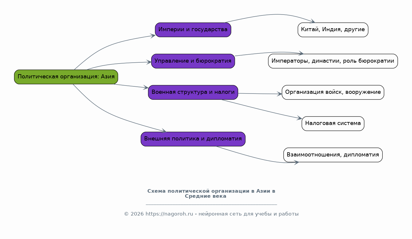 В этом разделе будет рассмотрена политическая организация азиатских обществ в Средние века. Он сосредоточится на анализе империй, таких как Китай, Индия, и другие государства региона, а также на особенностях их управления, включая роль императоров, династий и бюрократии. Будет проанализирована организация военных структур, налоговая система и влияние религии на политические процессы. Раздел также рассмотрит вопросы внешней политики, дипломатии, и взаимоотношений между различными государствами и народами.