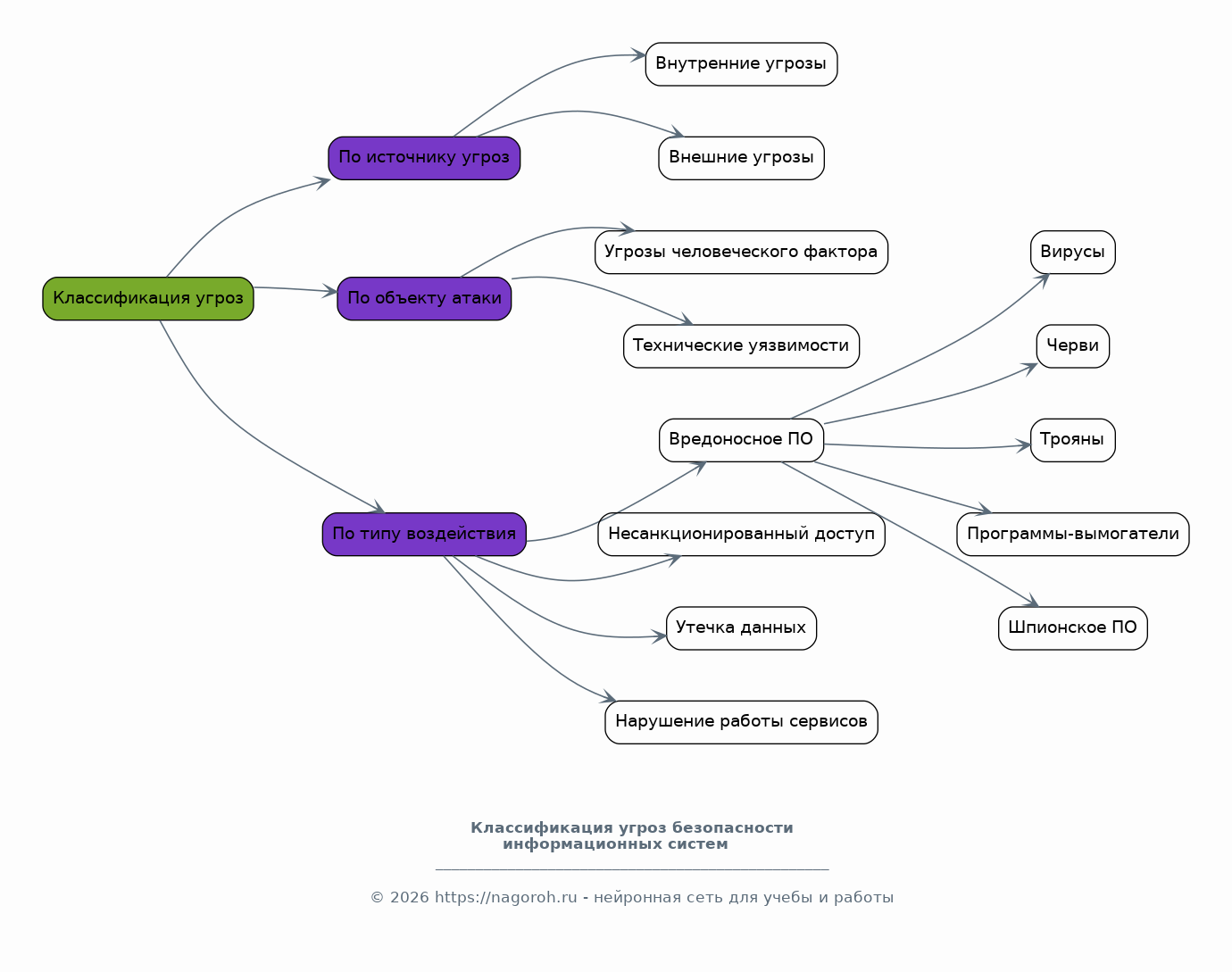 В этом разделе будет представлена систематизированная классификация угроз, основанная на различных характеристиках, включая источник угрозы, объект атаки и тип воздействия. Будут рассмотрены внутренние и внешние угрозы, а также угрозы, связанные с человеческим фактором и техническими уязвимостями. Особое внимание будет уделено классификации вредоносного программного обеспечения, такому как вирусы, черви, трояны, программы-вымогатели и шпионское ПО, с описанием их принципов работы и методов распространения. Классификация позволит структурировать понимание угроз и облегчит выбор эффективных методов защиты.