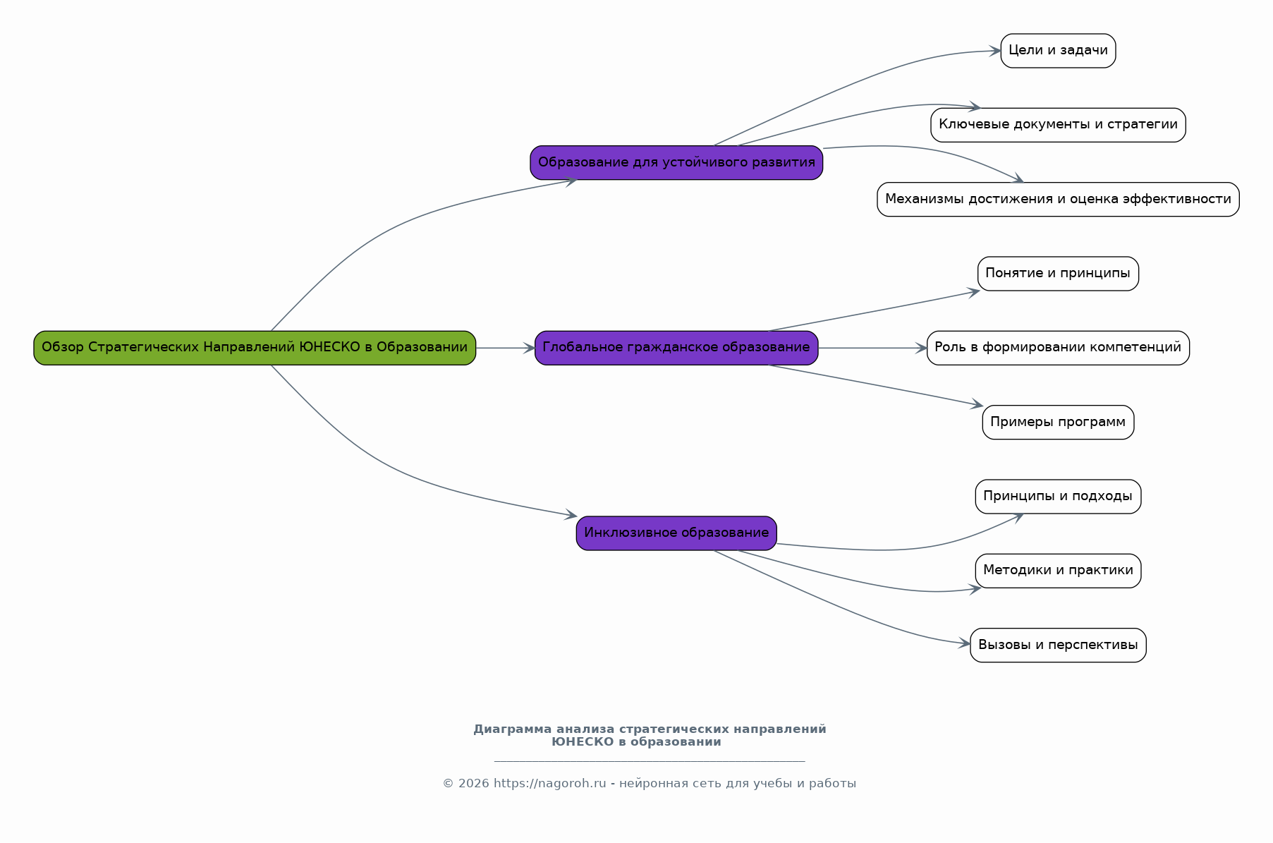Данный раздел посвящен детальному анализу стратегических направлений ЮНЕСКО в сфере образования, таких как образование для устойчивого развития, глобальное гражданское образование и инклюзивное образование. Рассматриваются ключевые документы, стратегии и программы, разработанные ЮНЕСКО для реализации этих направлений на различных уровнях образования. Особое внимание уделяется анализу целей и задач, поставленных ЮНЕСКО, а также механизмам их достижения и оценке эффективности. В разделе также проводится критический анализ текущих вызовов и перспектив, связанных с реализацией этих стратегических направлений.