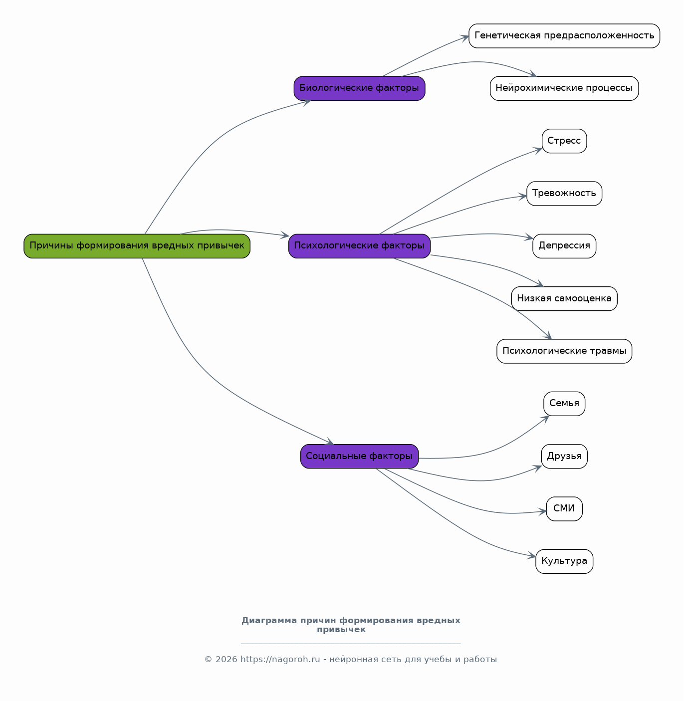Рассмотрение биологических факторов, влияющих на формирование зависимостей, таких как генетическая предрасположенность и нейрохимические процессы в мозге. Анализ психологических факторов, включая стресс, тревожность, депрессию, низкую самооценку и психологические травмы. Изучение социальных факторов, таких как влияние семьи, друзей, окружения, средств массовой информации и культуры в целом. Обсуждение роли возраста, пола и других демографических характеристик в формировании вредных привычек. Рассмотрение механизмов формирования зависимости.