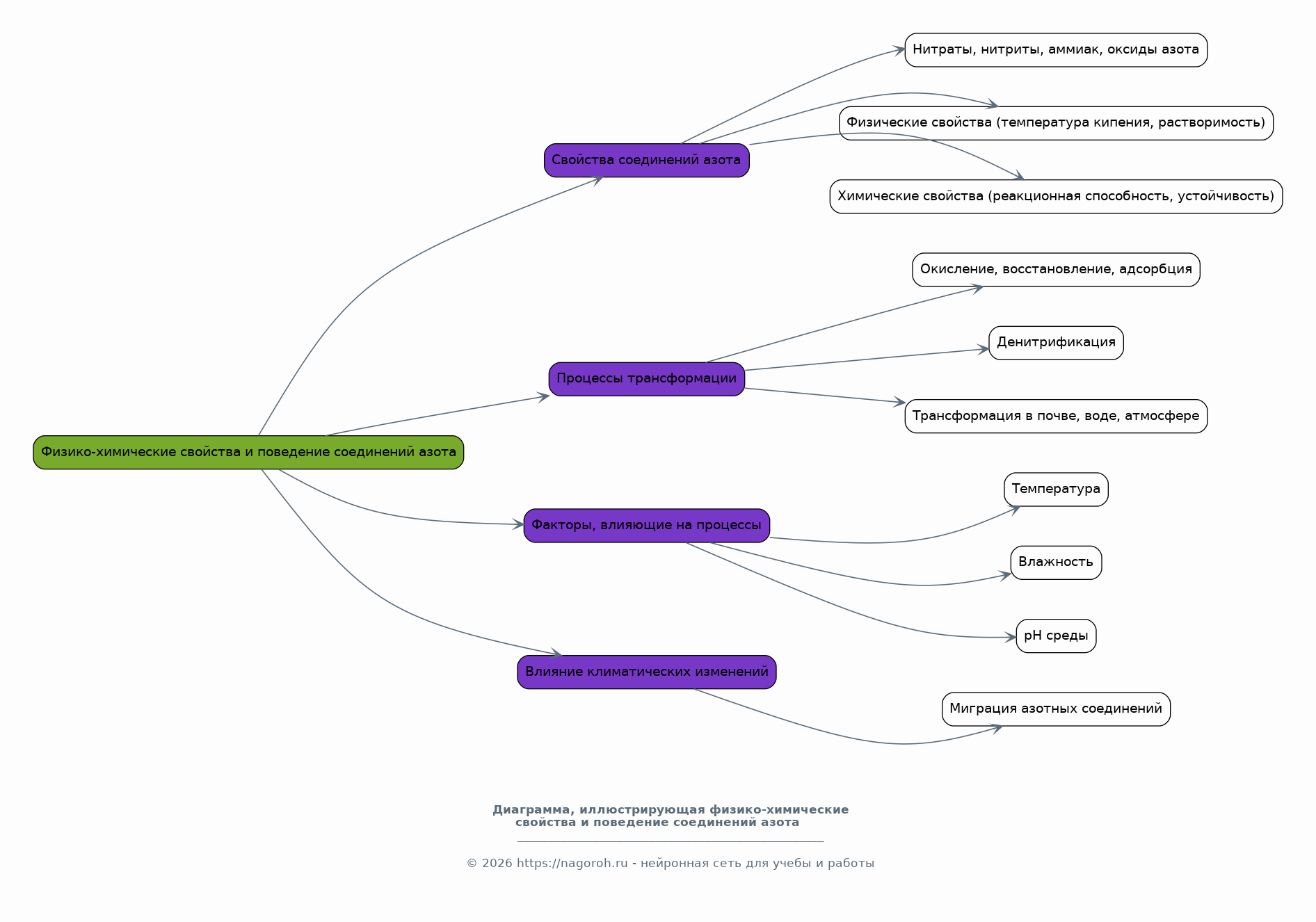 В данном разделе рассматриваются физико-химические свойства основных соединений азота, таких как нитраты, нитриты, аммиак и оксиды азота, определяющие их поведение в различных компонентах окружающей среды. Будут проанализированы процессы трансформации соединений азота в почве, воде и атмосфере, включая окисление, восстановление, адсорбцию и денитрификацию. Рассмотрят факторы, влияющие на эти процессы (температура, влажность, pH среды), и их значение для экологических последствий. Прогнозируется влияние климатических изменений на миграцию азотных соединений.