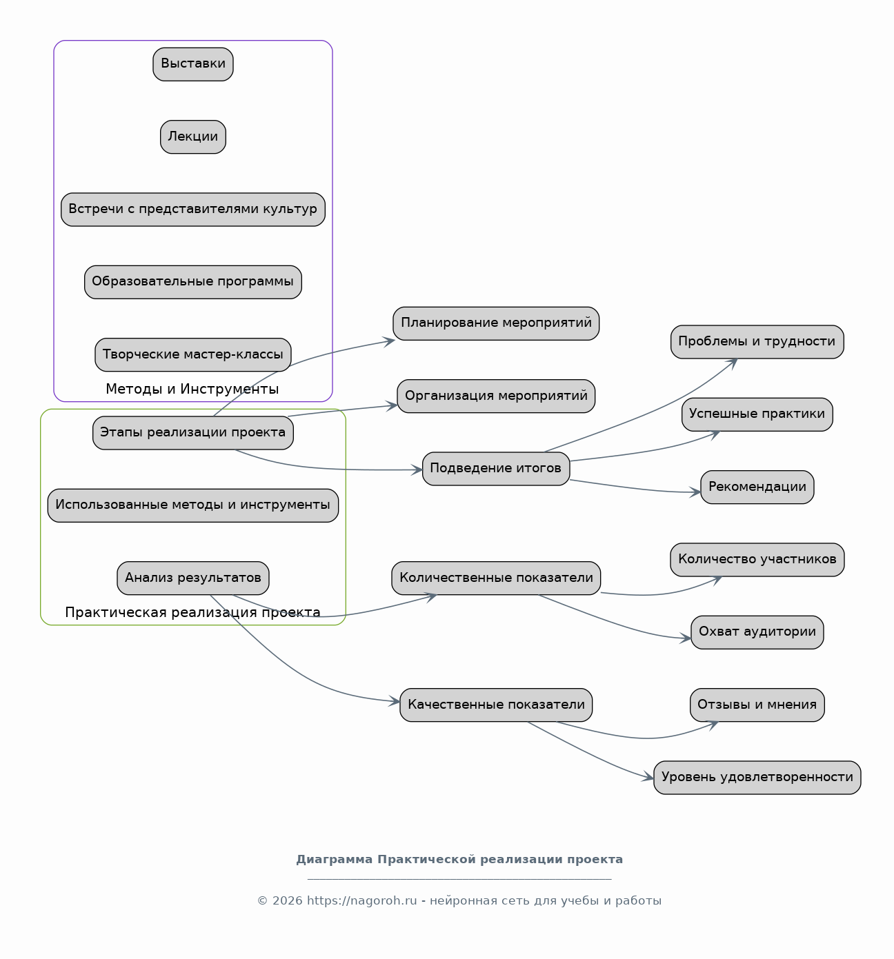 В этом разделе подробно описывается практическая реализация проекта, включая этапы его реализации, использованные методы и инструменты. Представлены данные о проведенных мероприятиях: выставках, лекциях, встречах с представителями разных культур, образовательных программах и творческих мастер-классах. Анализируются достигнутые результаты: количество участников, охват аудитории, отзывы и мнения. Особое внимание уделяется проблемам и трудностям, возникшим в ходе реализации проекта, а также способам их решения. Представляются примеры успешных практик, а также рекомендации по улучшению работы в будущем. Анализируются количественные и качественные показатели эффективности проекта: посещаемость мероприятий, уровень удовлетворенности участников, изменения в восприятии культурного многообразия.