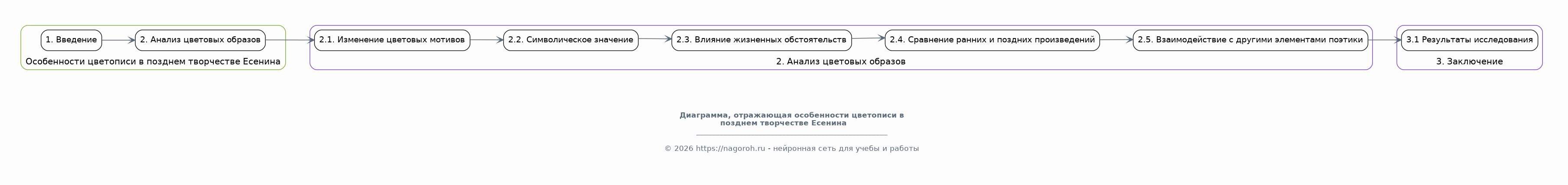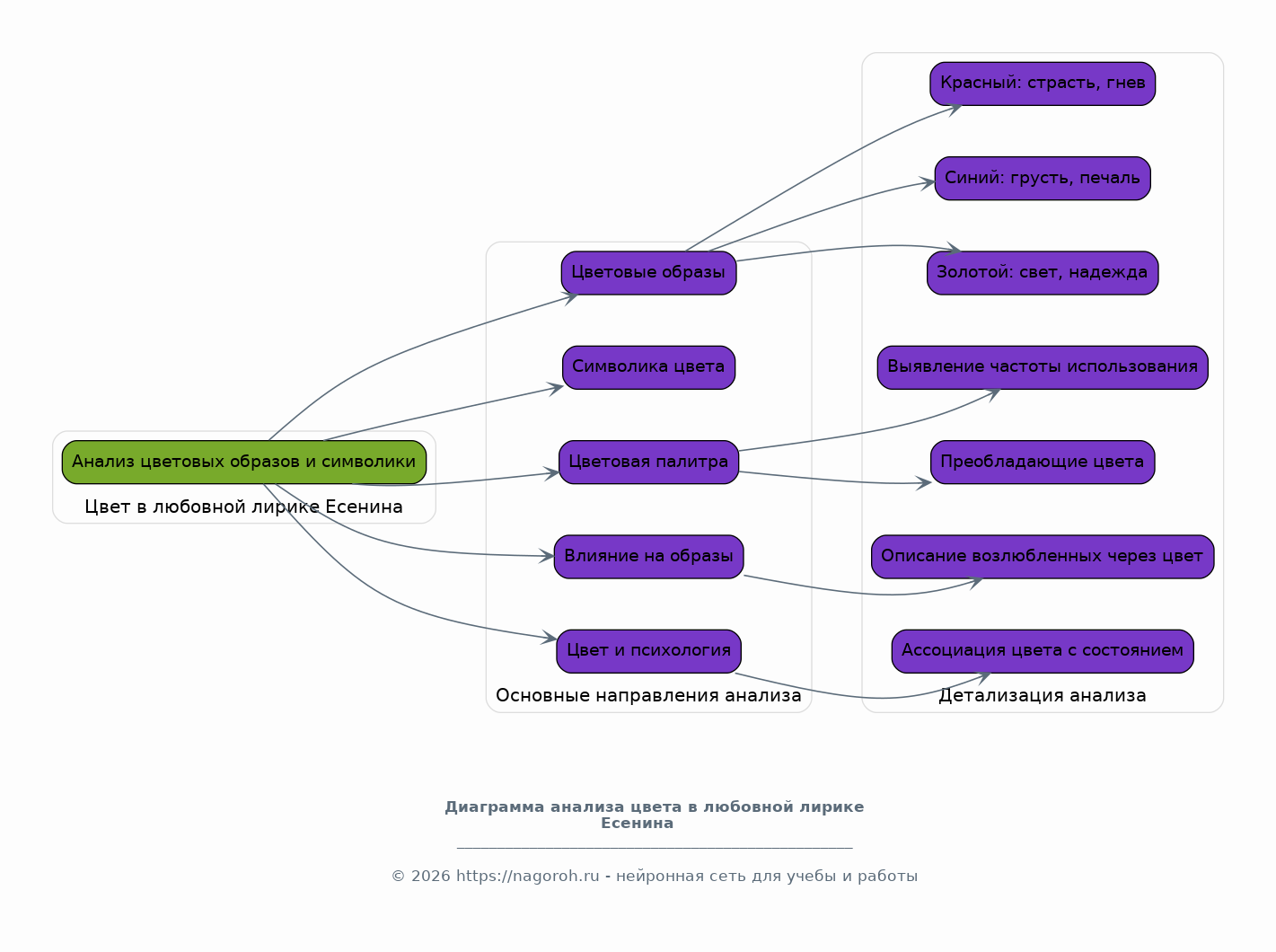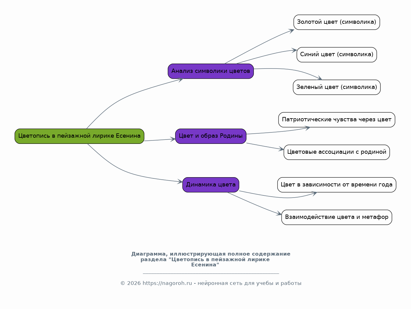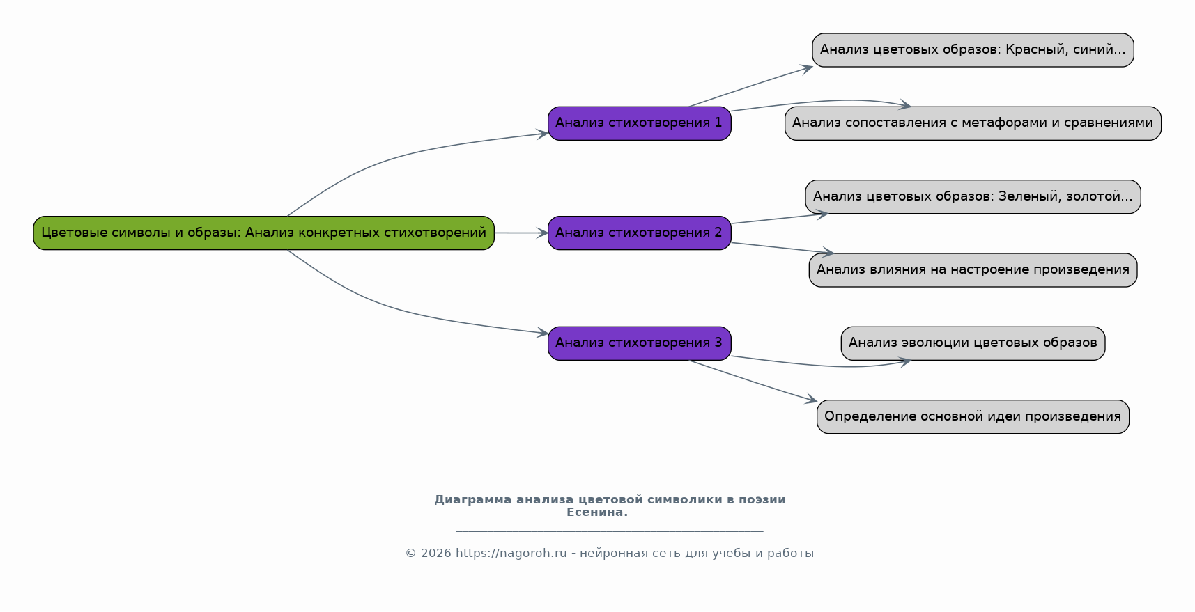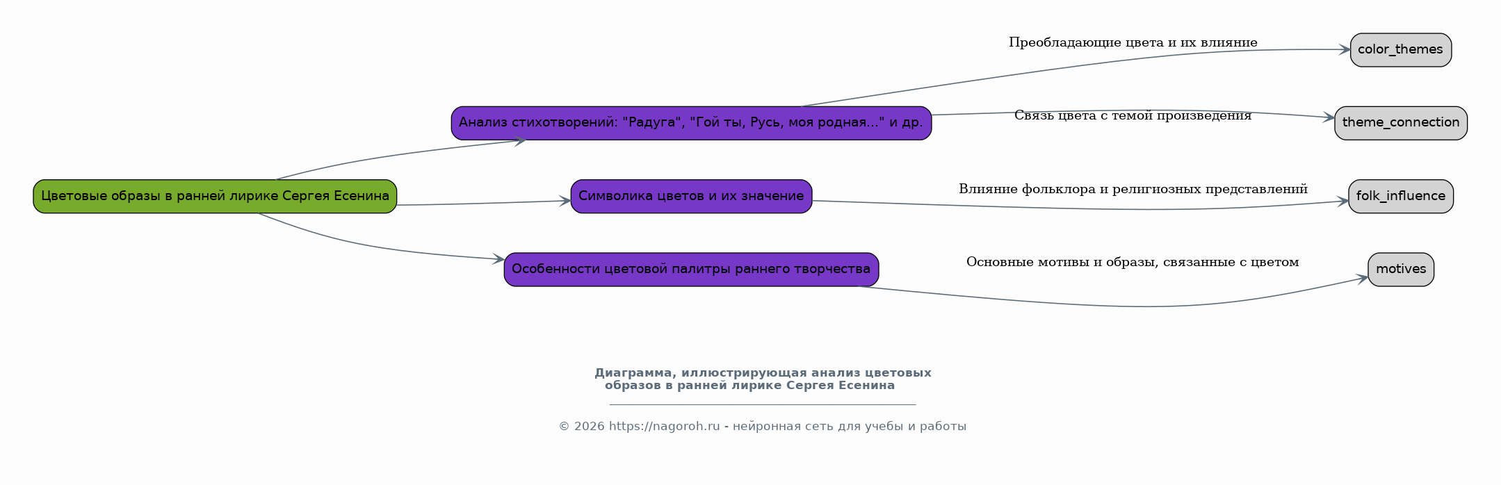 Данный исследовательский проект посвящен глубокому изучению цветописи в поэтическом наследии Сергея Есенина. Цель работы – выявить особенности использования цвета как средства художественной выразительности, проанализировать его символическое значение и роль в создании образной системы произведений поэта. В рамках исследования будет проведен детальный анализ цветовых образов в различных стихотворениях Есенина, начиная с ранних работ и заканчивая поздним периодом творчества. Будет рассмотрено, как цвет влияет на восприятие пейзажей, характеров персонажей и общую атмосферу стихотворений. Особое внимание будет уделено взаимодействию цвета с другими выразительными средствами, такими как метафора, эпитет и аллегория. В ходе исследования будут применены методы литературоведческого анализа, включая семантический, структурный и сравнительный подходы. Теоретической основой работы станут труды отечественных и зарубежных исследователей, посвященные творчеству Есенина, а также работы по теории литературы и семиотике. Практическая часть проекта предполагает систематизацию данных, создание таблиц и схем, иллюстрирующих частотность использования различных цветов и их символические значения в различных произведениях. Результаты исследования могут быть использованы в учебном процессе, при подготовке докладов и рефератов, а также для более глубокого понимания поэтического мира Есенина.