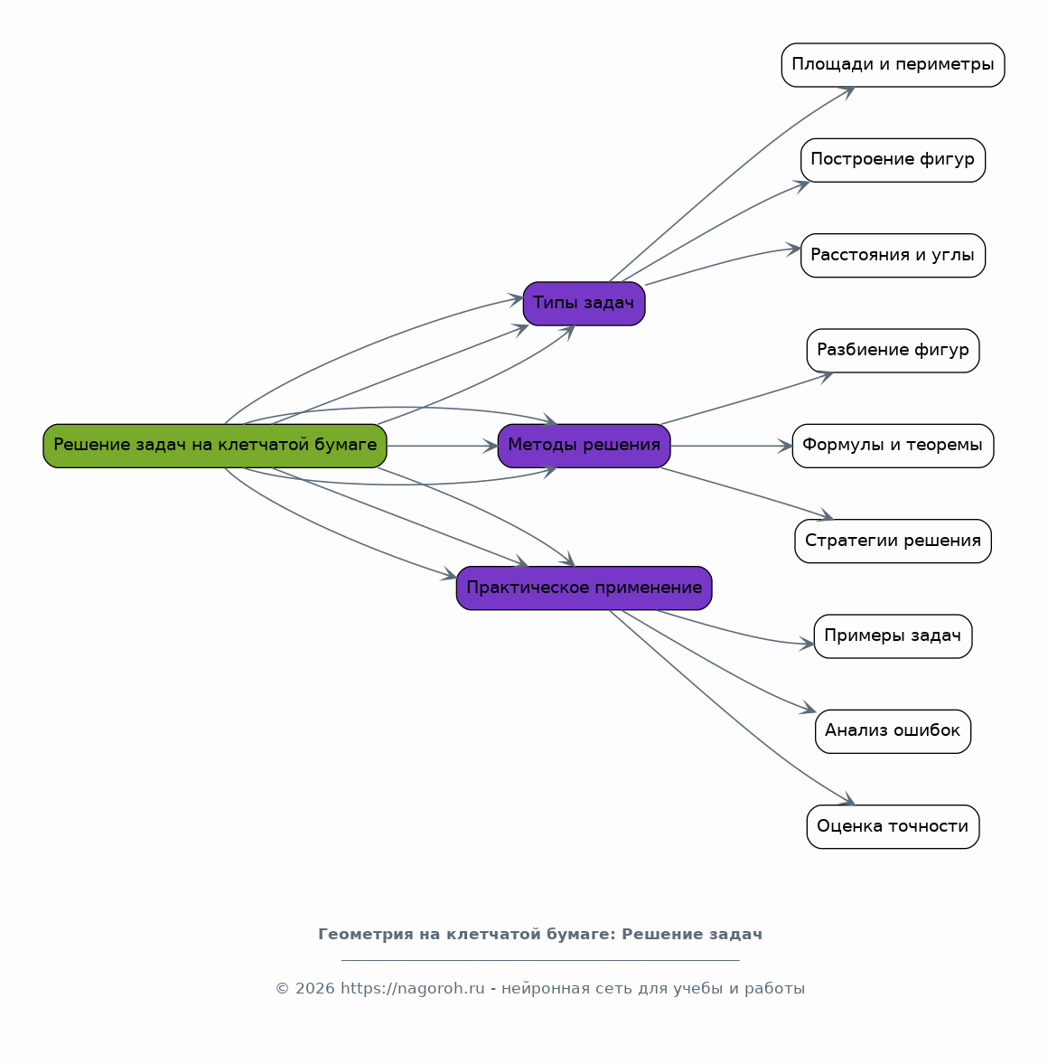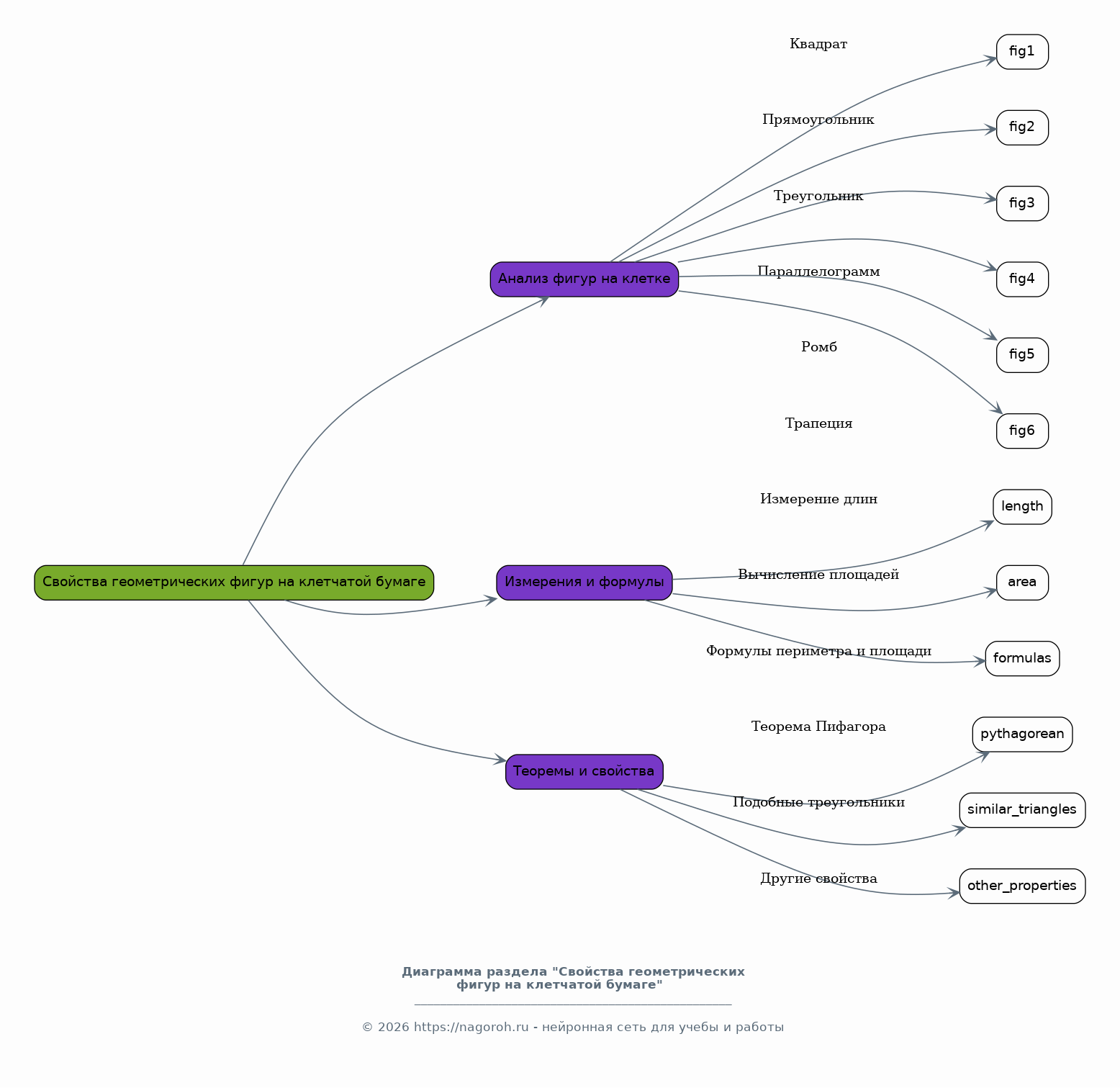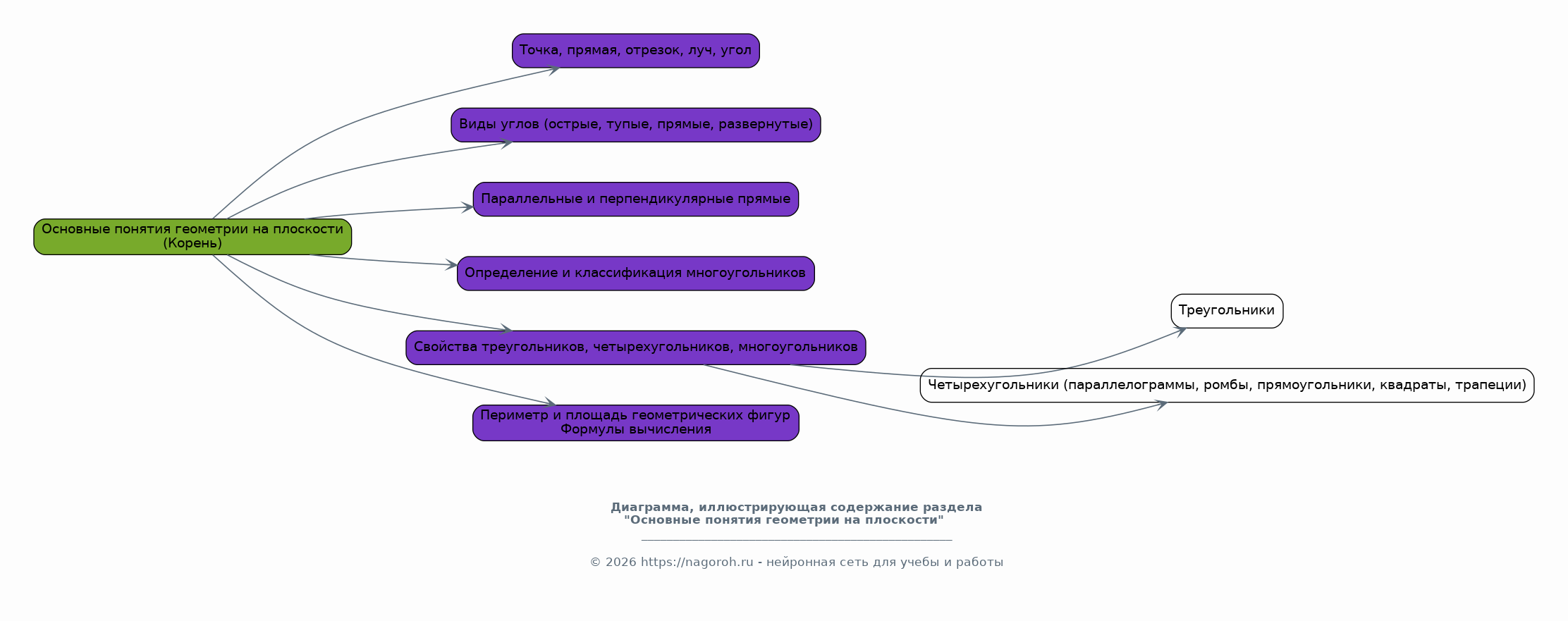 Рассмотрение основных геометрических понятий: точка, прямая, отрезок, луч, угол. Изучение видов углов (острые, тупые, прямые, развернутые). Понятие о параллельных и перпендикулярных прямых. Определение многоугольников и их классификация. Свойства треугольников, четырехугольников, многоугольников. Рассмотрение понятий периметра и площади геометрических фигур. Теоретический обзор формул для вычисления периметров и площадей. Изучение свойств различных геометрических фигур, таких как треугольники, четырехугольники (параллелограммы, ромбы, прямоугольники, квадраты, трапеции) и многоугольники, их классификация. Перечисление основных теорем и свойств, используемых в геометрии.