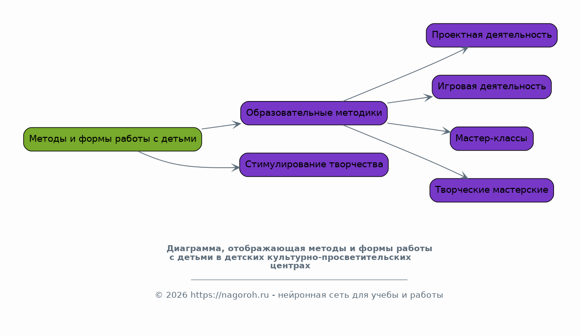 Раздел посвящен рассмотрению различных методов и форм работы с детьми в детских культурно-просветительских центрах. Будут проанализированы существующие образовательные методики, применяемые в сфере дополнительного образования и культурного досуга, такие как проектная деятельность, игровая деятельность, мастер-классы, творческие мастерские, и т.д. Будут рассмотрены особенности применения различных форм работы с детьми разных возрастных групп, а также методы стимулирования творческой активности и развития способностей детей. Кроме того, будут предложены практические рекомендации по организации различных мероприятий, таких как фестивали, конкурсы, выставки, и т.д., направленных на развитие творческого потенциала детей.