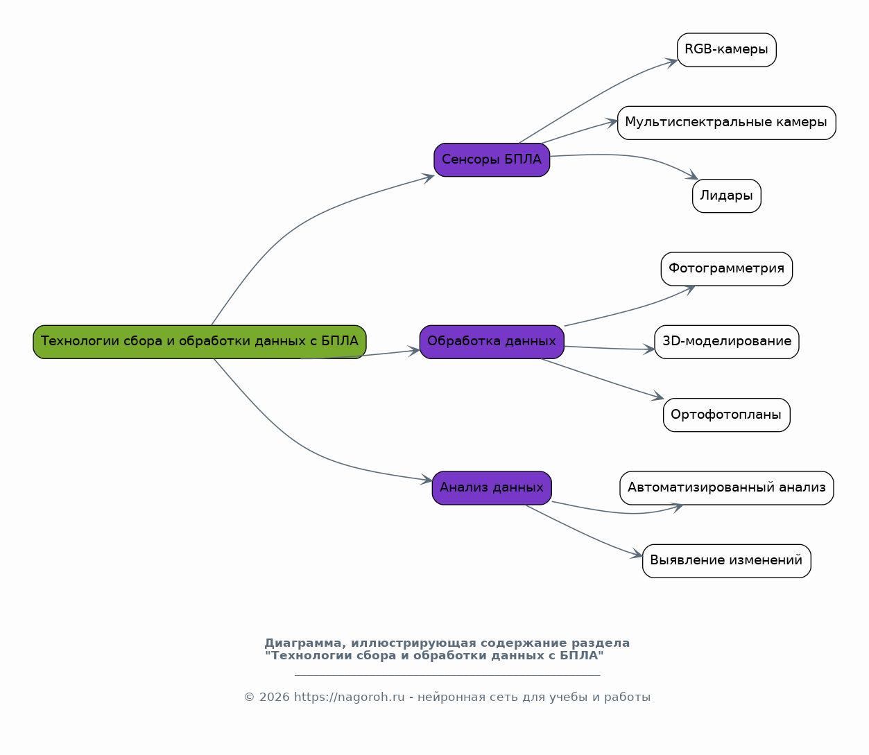 Детальное рассмотрение технологий, применяемых для сбора данных с БПЛА, включая различные типы сенсоров (RGB-камеры, мультиспектральные камеры, лидары) и их характеристики. Анализ методов обработки данных, полученных с БПЛА, таких как фотограмметрия, создание 3D-моделей и ортофотопланов. Рассмотрение программного обеспечения, используемого для обработки данных, включая его функциональные возможности, преимущества и недостатки. Обзор возможностей автоматизированного анализа данных, полученных с БПЛА, для выявления изменений и дефектов в строительных конструкциях. Оценка точности и надежности различных методов обработки данных. Особое внимание уделяется вопросам совместимости данных.