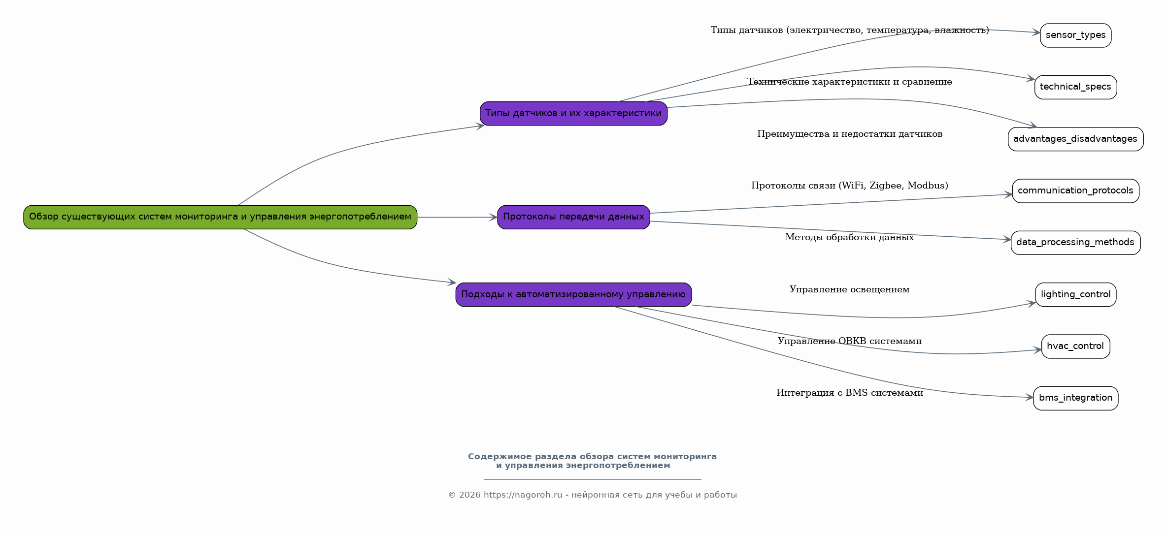 В данном разделе будет проведен всесторонний обзор существующих систем мониторинга и управления энергопотреблением. Будут проанализированы различные типы датчиков, используемых для сбора данных об энергопотреблении, включая их технические характеристики, преимущества и недостатки. Будут рассмотрены различные протоколы передачи данных и методы обработки информации, применяемые в современных системах. Анализ будет охватывать различные подходы к автоматизированному управлению энергопотреблением, включая управление освещением, отоплением, вентиляцией и кондиционированием воздуха (ОВКВ), а также интеграцию с системами управления зданием (BMS). Будут выделены ключевые проблемы и ограничения, присущие существующим решениям, и определены возможности для их улучшения и оптимизации.