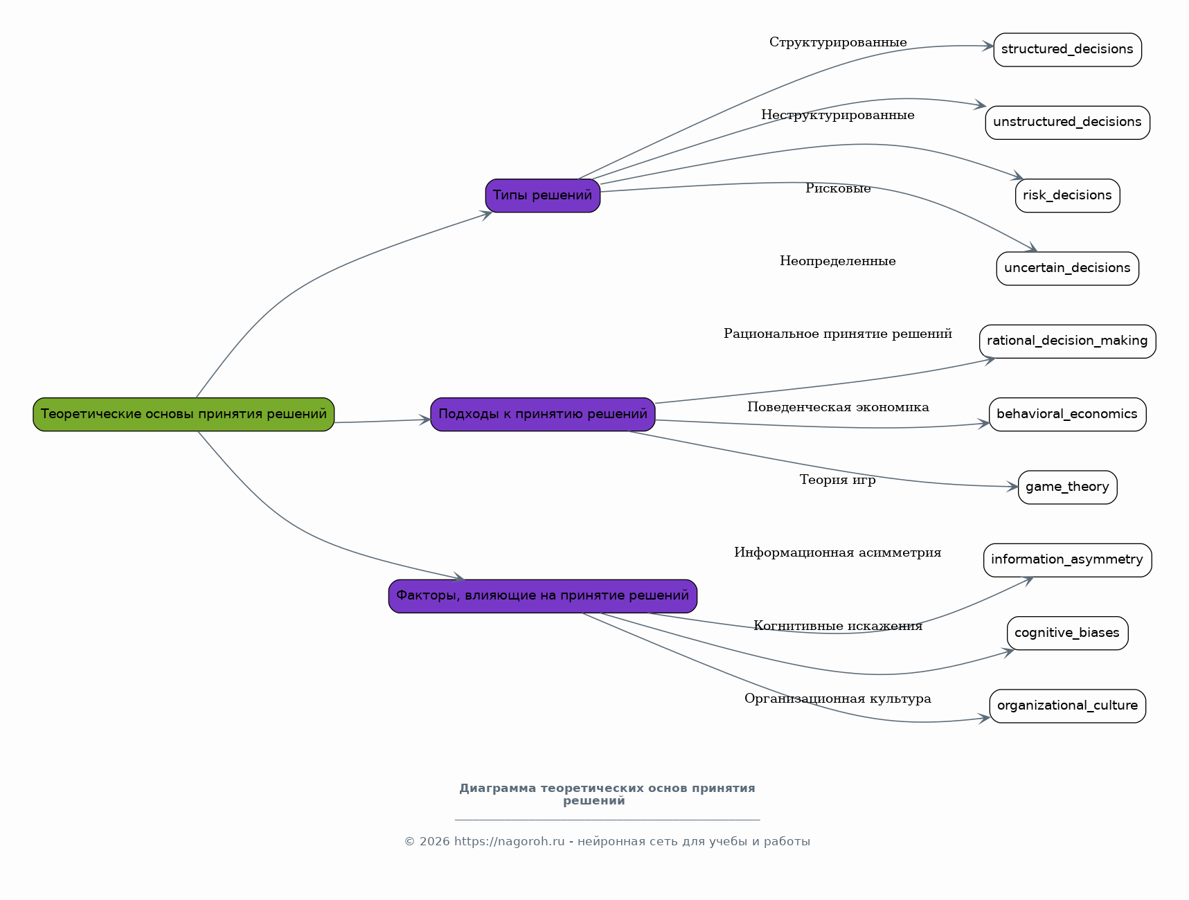 Обзор теоретических подходов к принятию решений, включая классические и современные теории. Анализ различных типов решений (структурированные, неструктурированные, рисковые, неопределенные). Рассмотрение методов анализа данных и моделирования, применяемых в процессе принятия решений. Раскрываются основные концепции, инструменты и методы, необходимые для понимания природы принятия решений, включая рациональное принятие решений, поведенческую экономику и теорию игр. Подробно рассматриваются факторы, влияющие на процесс принятия решений, такие как информационная асимметрия, когнитивные искажения и организационная культура. Обсуждается роль математических методов и компьютерного моделирования в поддержке принятия решений.