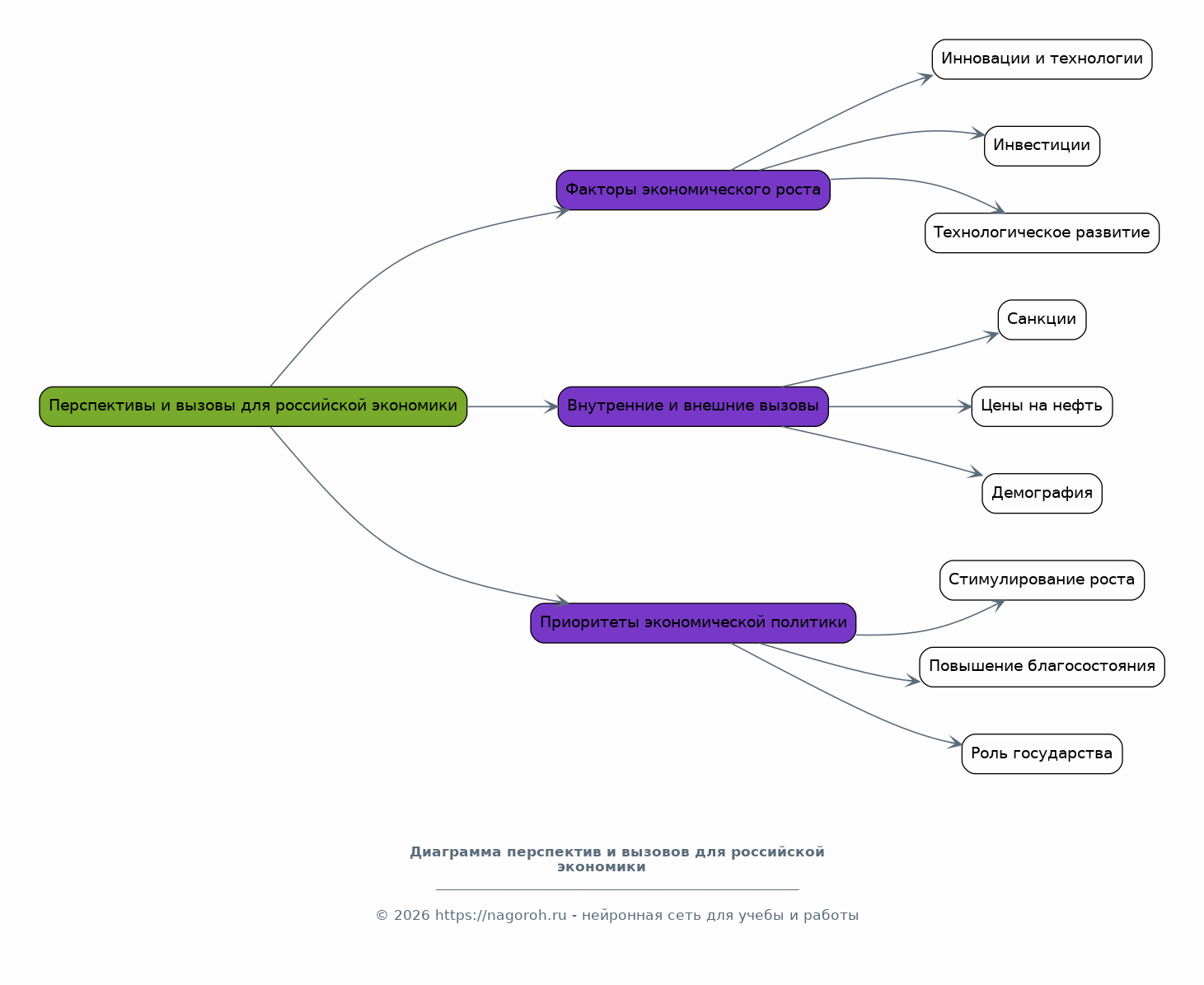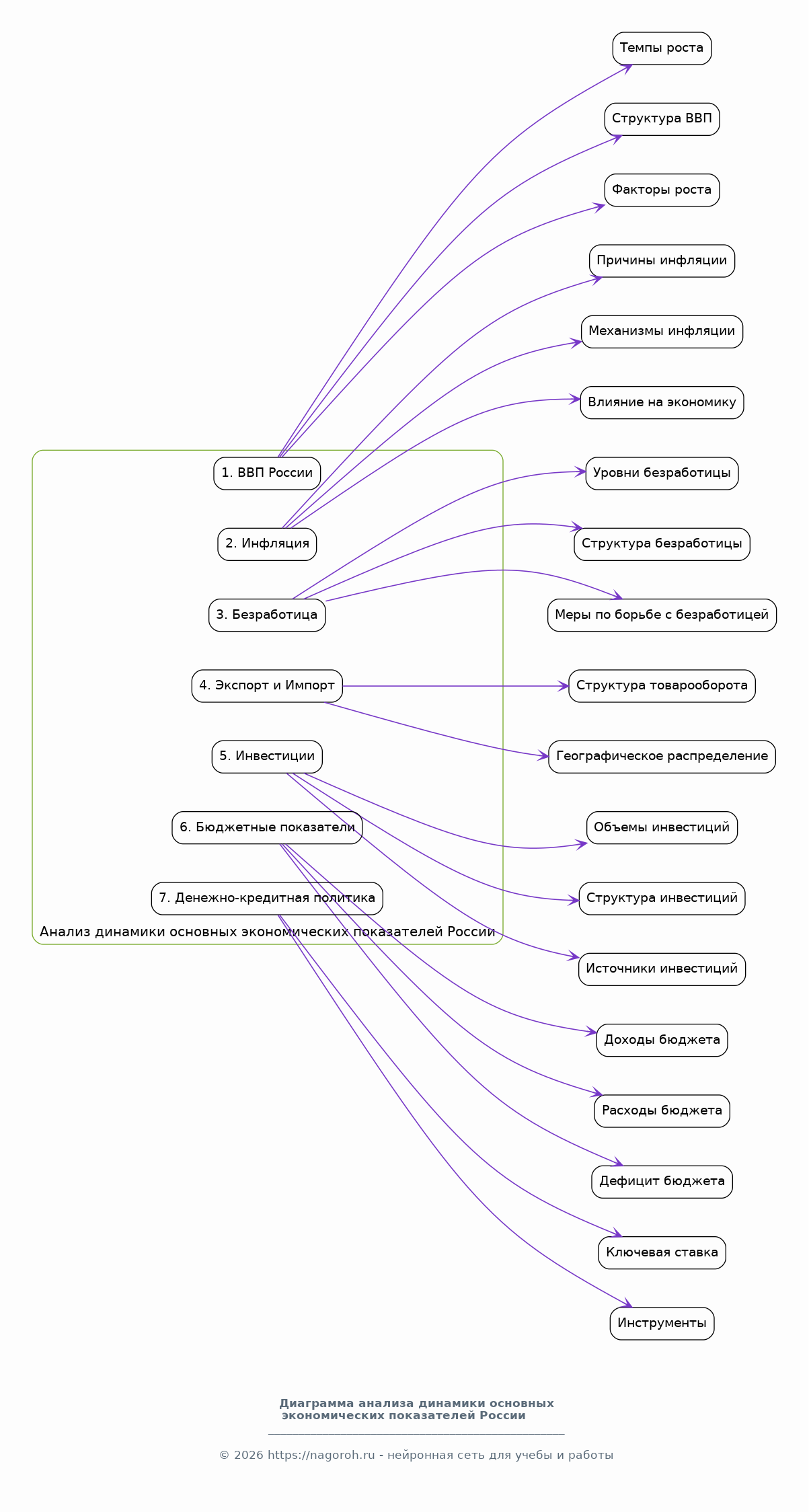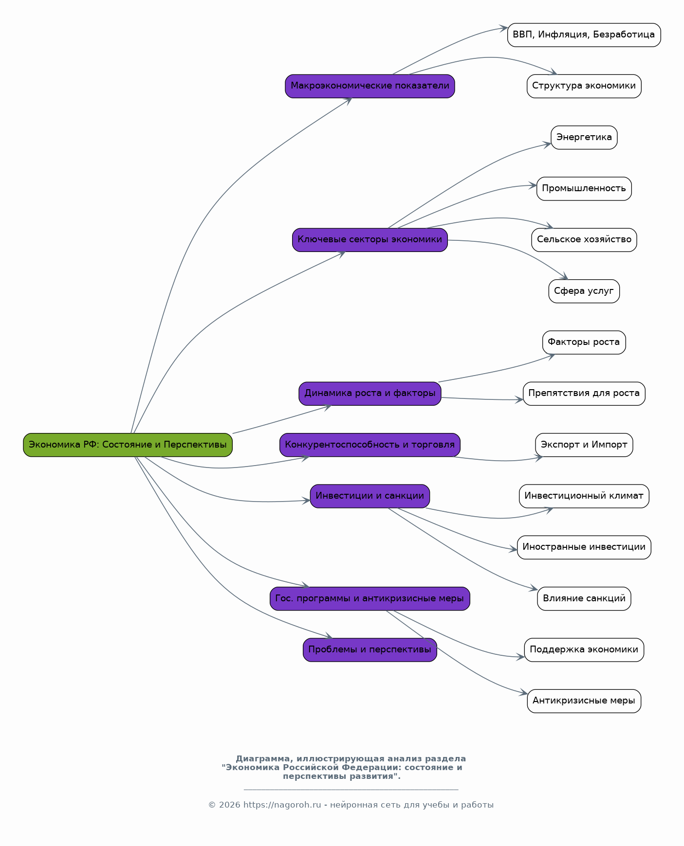 Анализ текущего состояния экономики России, включая основные макроэкономические показатели: ВВП, инфляция, безработица, структура экономики. Рассмотрение ключевых секторов российской экономики: энергетика, промышленность, сельское хозяйство, сфера услуг. Анализ динамики экономического роста, факторов, влияющих на его величину, и препятствий для роста. Оценка уровня конкурентоспособности российской экономики на мировом рынке, включая анализ экспорта и импорта. Исследование инвестиционного климата, привлечения иностранных инвестиций и влияния санкций. Обзор государственных программ поддержки экономики и антикризисных мер. Анализ проблем и вызовов, стоящих перед российской экономикой, а также перспектив ее развития.