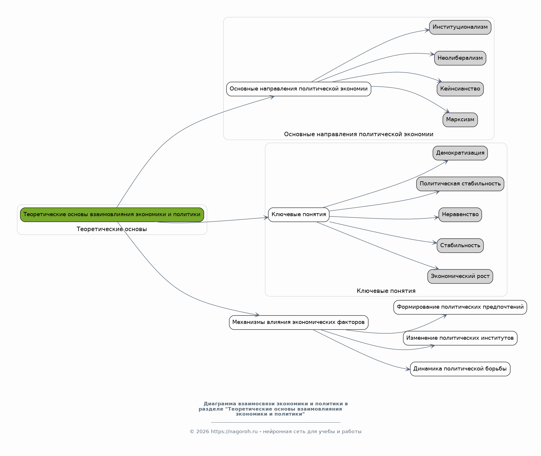 Раздел посвящен анализу существующих теоретических подходов к исследованию взаимосвязи экономики и политики. Будут рассмотрены основные направления политической экономии, включая марксизм, кейнсианство, неолиберализм и институционализм. Будет осуществлен анализ ключевых понятий, таких как экономический рост, стабильность, неравенство, политическая стабильность и демократизация. Особое внимание будет уделено объяснению механизмов, через которые экономические факторы влияют на политические процессы, такие как формирование политических предпочтений, изменение политических институтов и динамика политической борьбы. Также будут проанализированы научные работы и концепции, демонстрирующие связь между экономическими условиями, такими как уровень безработицы, инфляции, экономическое неравенство, и политическими исходами.